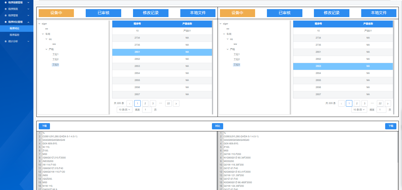 示图5:程序调用与回传可以选择任意两段程序进行对比,程序可以来源于可以是设备中、已审核、修改记录、本地文件,将程序不一致的地方高亮显示。