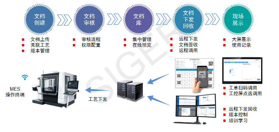 四、功能模块拓展-ESOP电子文件管理系统西格数据凭借丰富的现场经验与客户的宝贵反馈,成功研发出DNC程序管理系统,并同步推出西格ESOP电子文件管理系统。该系统旨在为用户提供一站式的文档管理平台,涵盖文档创建、审核及现场展示等全流程。通过实现在线远程上传与下发文档的功能,该系统为提升生产管理水平提供了有力的数据支持。