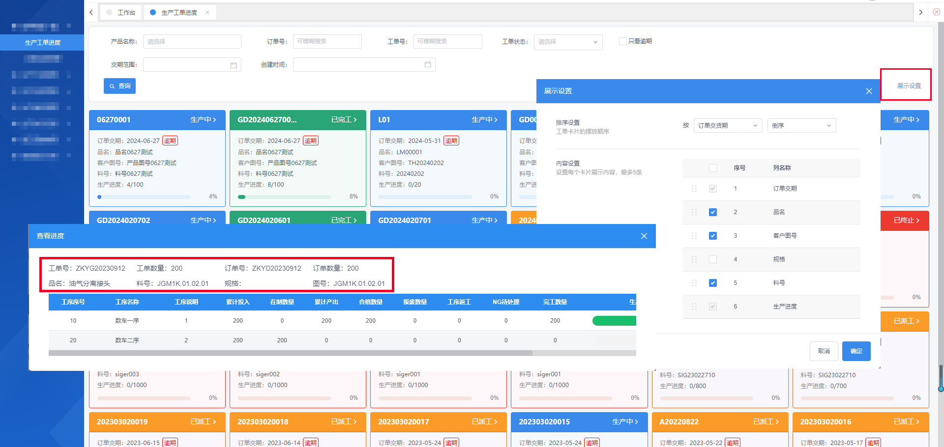 为了提高生产工单进度的管理效率,针对工单卡片进行了全面优化,新增了工单卡片展示内容可灵活配置的功能,使用户能够根据需求自定义展示内容;同时,“查看进度”对话框也得到了改进,增加展示字段,帮助企业实现更加精细和深入的管理。