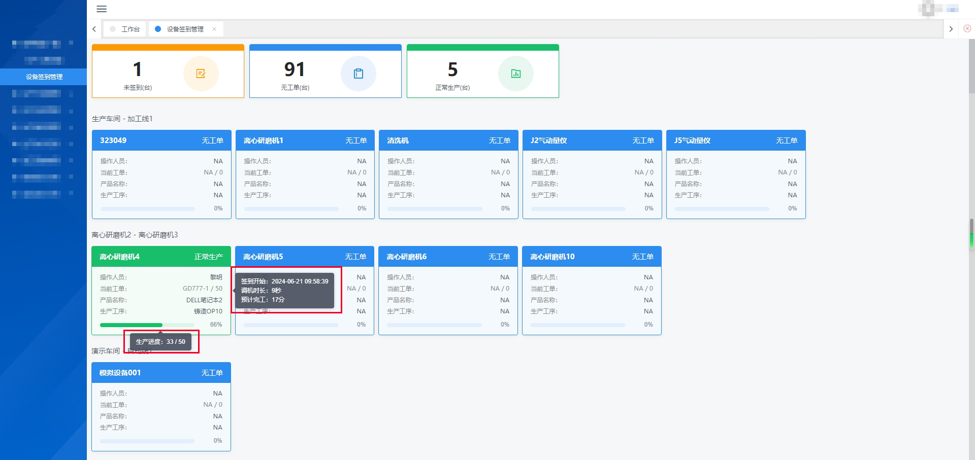 为了增强设备签到管理功能的使用便捷性及提升生产流程的可见性,针对展示内容进行了优化,新增卡片悬浮展示功能,包括签到时间、调机时长、预计完工时间、生产进度等关键生产信息,帮助企业能够以更直观的方式快速获取重要数据。