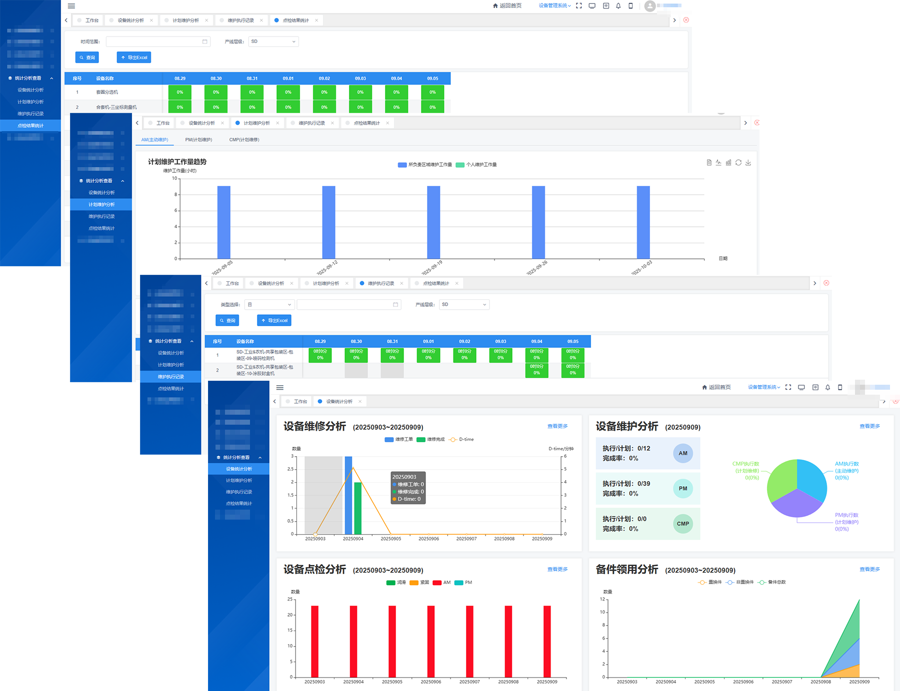 数据并非堆砌即是,精准方显智慧。本次迭代新增全局“统计分析看板”,深度融合设备维护全链路信息,实现维修、保养、点检与备件领用多维一体化监控与智能分析。系统实时追踪任务进度与逾期风险,支持年/月/日多级穿透分析,赋能工厂厂长纵览全局、预判资源,设备主管实时控效、降停提产,助力企业从“被动响应”迈向“主动优化”,成就设备管理精益化与智能化新高度。