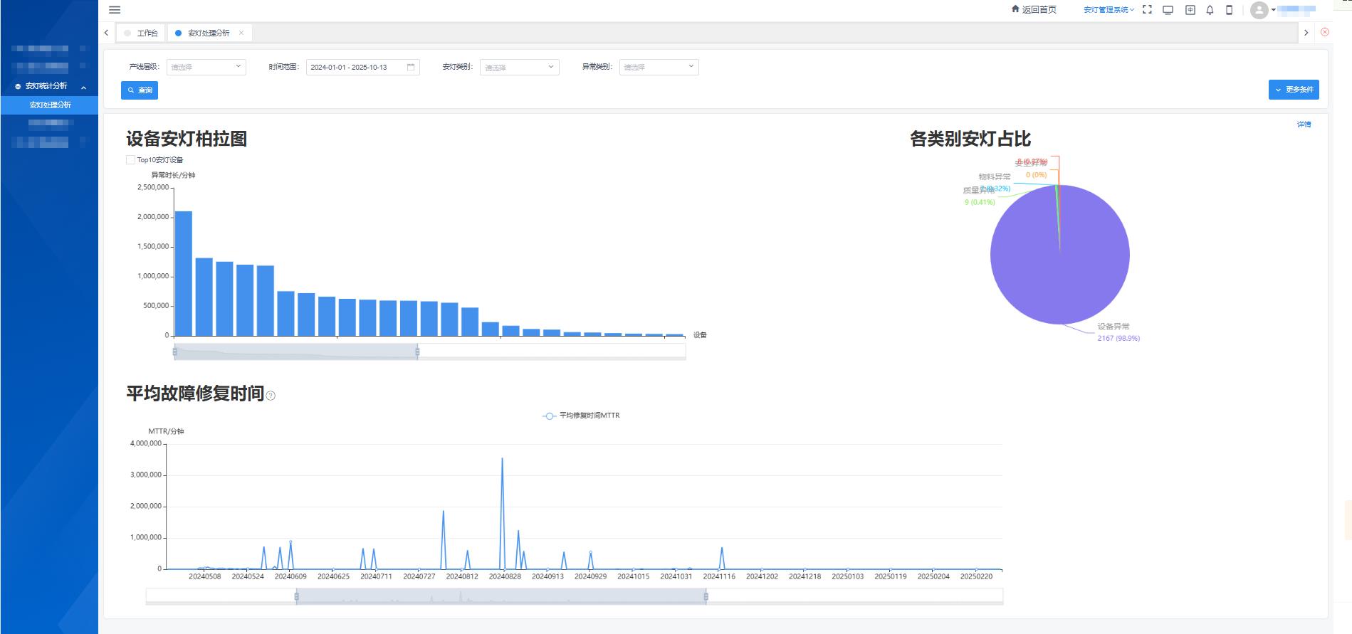 数据是精益改善的核心引擎,本次迭代新增安灯处理分析功能,将海量安灯数据转化为决策智慧。通过深度剖析安灯次数、时长、MTTR及异常类型,助力管理者精准洞察重复性故障根源,识别高发异常类型,优化维保策略,配置关键资源,从而驱动整体设备效率(OEE)的持续提升,迈向智能制造新纪元。