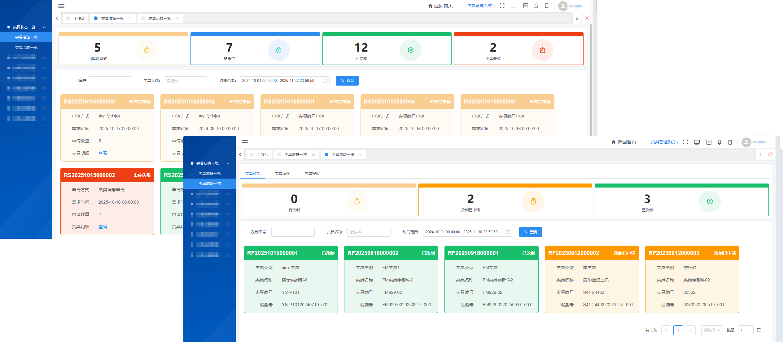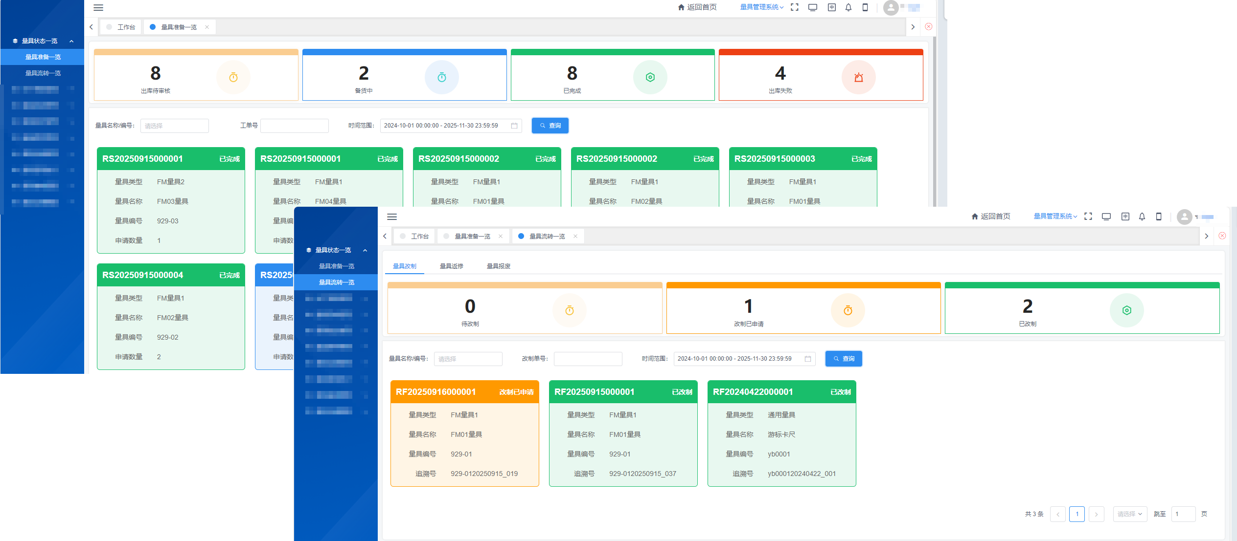 管理不靠人工盘点,系统实时呈现资源状态。“夹具状态一览”功能为企业打造实时资源看板,从申请到上机,每个环节尽在掌握。生产主管可据此精准预判准备周期,优化产线协同,确保生产无缝衔接。对于异常夹具,系统同样提供全生命周期状态追踪,无论是维修还是报废,流程透明,处理高效,让夹具资源真正成为生产的加速器。