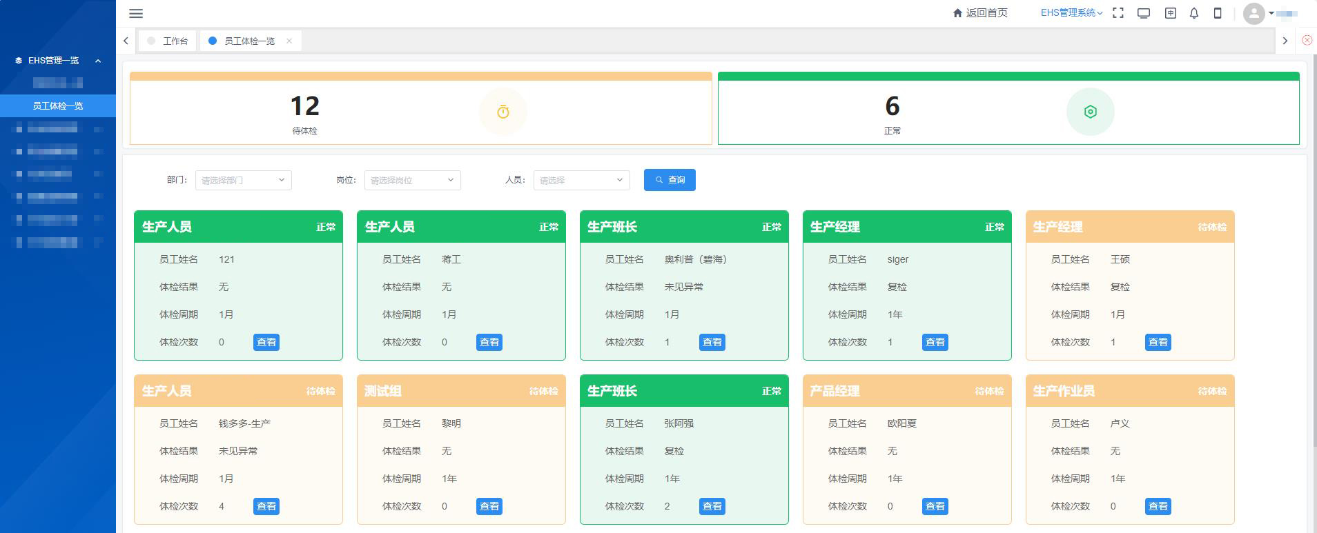 员工健康是企业永续的基石。系统全新引入“员工体检一览”模块,将全员体检信息电子化归档,支持按待检、已完成、异常状态等多维度筛选查看。健康数据实时同步、状态一目了然,帮助安全与人事管理者快速定位待检人员与重点关注对象,全面提升人员健康管理的精准性与及时性。
