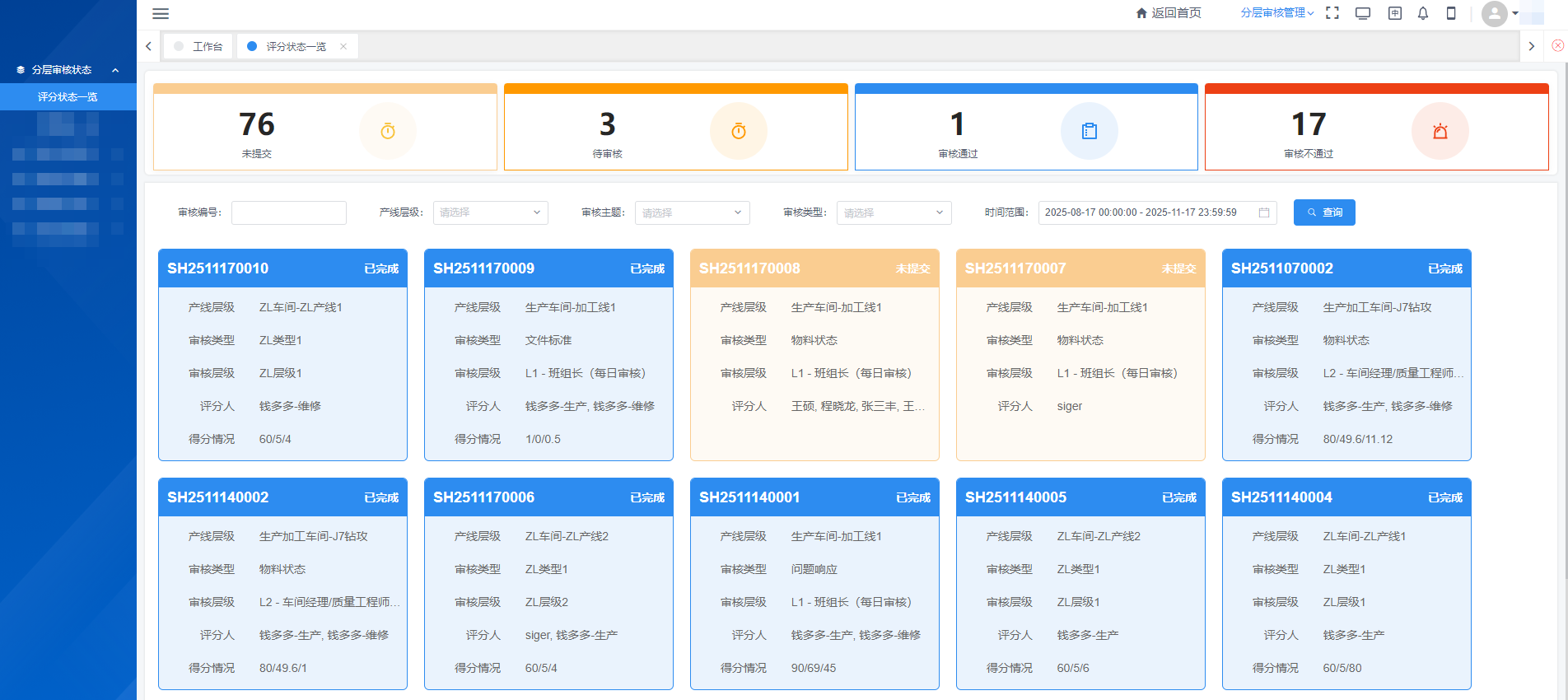 标准引领方向,执行决定成效。全新推出的"评分状态一览"功能,集中展示所有审核计划的执行进度与评分结果。审核负责人可实时掌握各环节完成状态,快速识别滞后任务,确保审核计划按期推进,实现从任务下发到结果确认的全流程透明化管理。