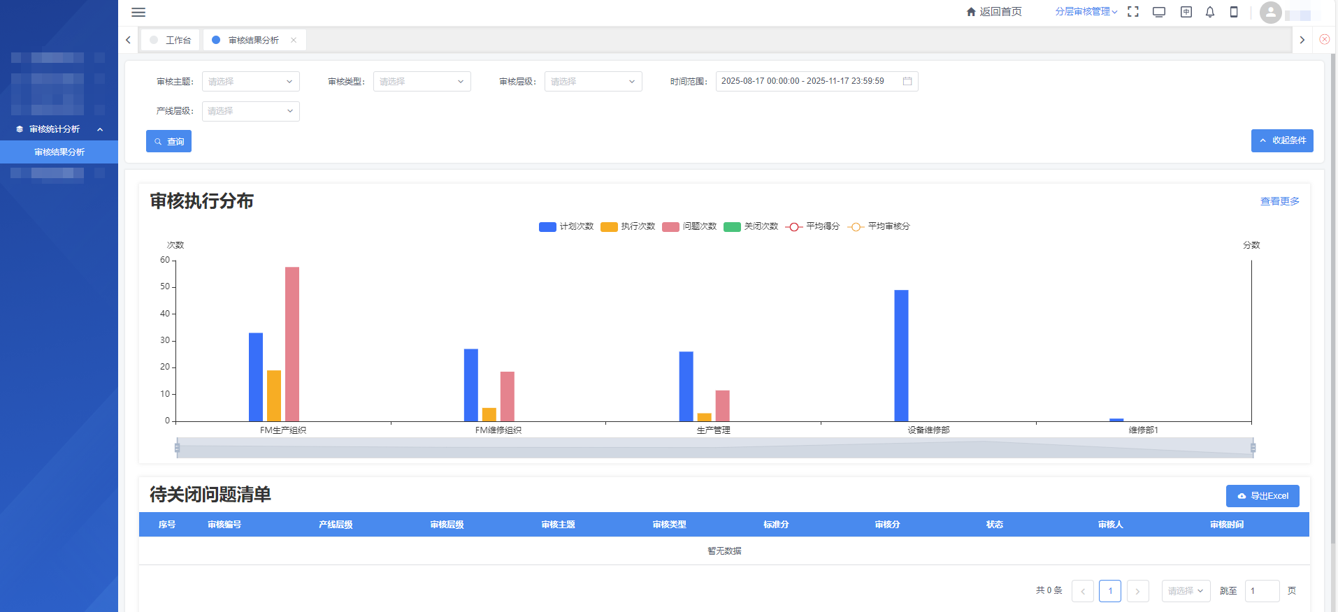 数据驱动决策,分析创造价值。全新上线的“审核结果分析”功能,为分层审核提供了全面的量化评估体系,从部门维度全景呈现分层审核的计划执行、问题整改与改善趋势。通过深度分析问题发现率与关闭率的变化趋势,实现对管理成效的精准评估与趋势研判,帮助管理者识别改进方向,为优化审核策略、调整检查内容提供数据支撑,实现从"经验判断"到"数据驱动"的管理升级。