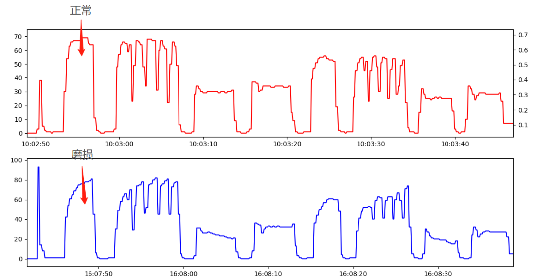 现场为FNAUC数控系统的车床,西格数据为客户部署刀具监控终端(TMS),与机床进行通讯,实现机床数据的高频采集,下图是徐工随车现场的刀具实时负载曲线图。