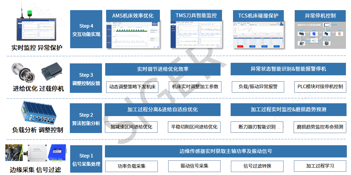 实时采集边缘信号,结合机床时序提取加工特征,实时监控刀具状态,异常报警并控制停机