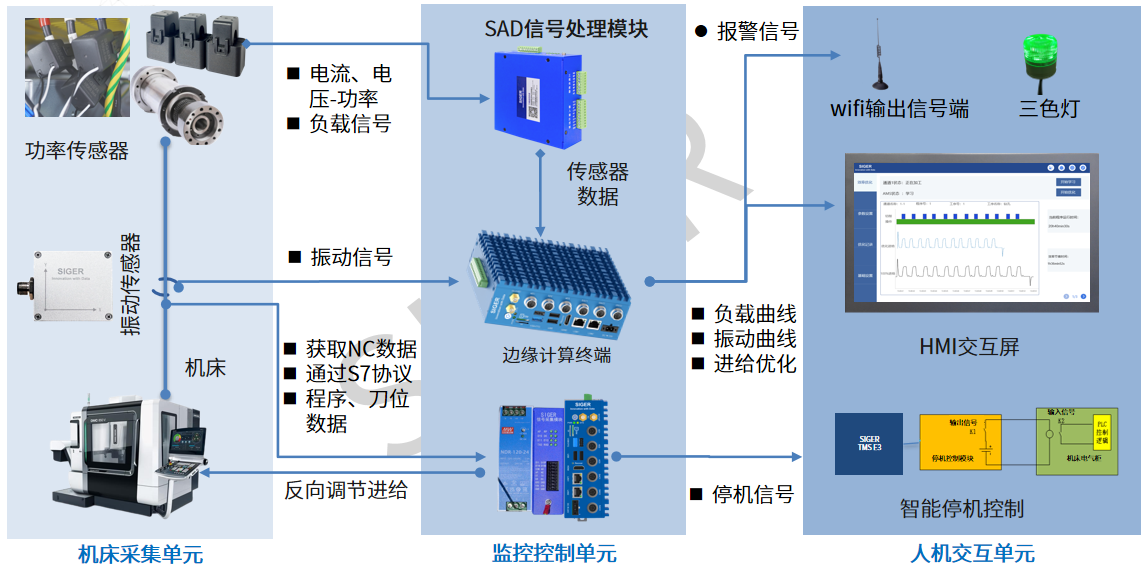 机加工过程中,主轴为加工刀具提供切削力,切削力的大小与主轴负载成正相关同时伴随主轴振动。因此系统基于“机床数控+传感器检测(振动信号+电信号+位移信号)结合机床运动过程可智能识别区分加减速区间和平稳切削加工区间结合加工过程特征实时调整机床进给倍率,优化机床效率!同时系统基于边缘信号采集分析,可实时监控机床加工及刀具状态;自学习记录加工过程负载及振动变化,基于信号包络线系统智能识别断刀、崩刃及磨损异常,通过PLC停机模块实现智能停机控制