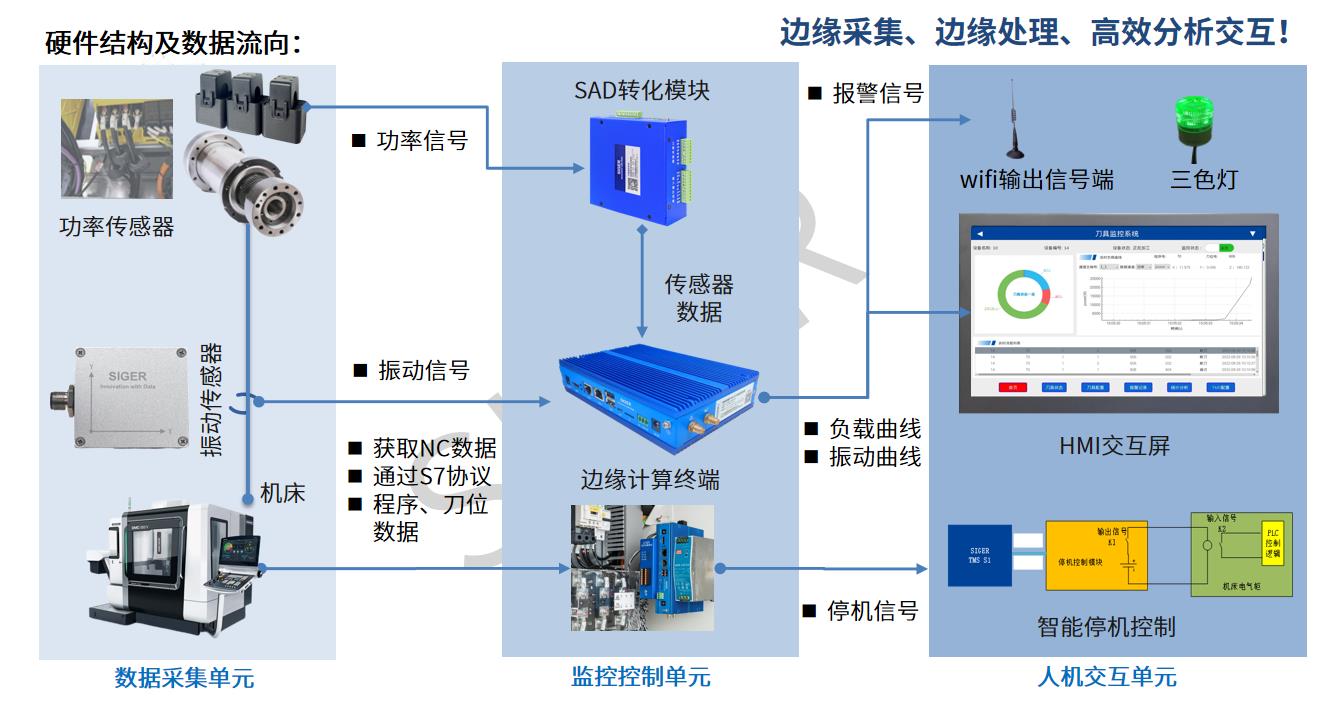 刀具监控系统(Tool Monitoring System,TMS)是一种针对精密加工过程中刀具状态监控和管理的解决方案,该系统通过边缘传感器收集数据,并利用智能算法分析这些数据,以实时监控刀具状态,断刀、崩刃智能诊断,并实现停机控制,真正意义上做到预测刀具寿命,帮助企业在生产过程中对停机换刀的处理更加游刃有余,避免因崩刃断刀而造成的设备损坏与产品质量损失!