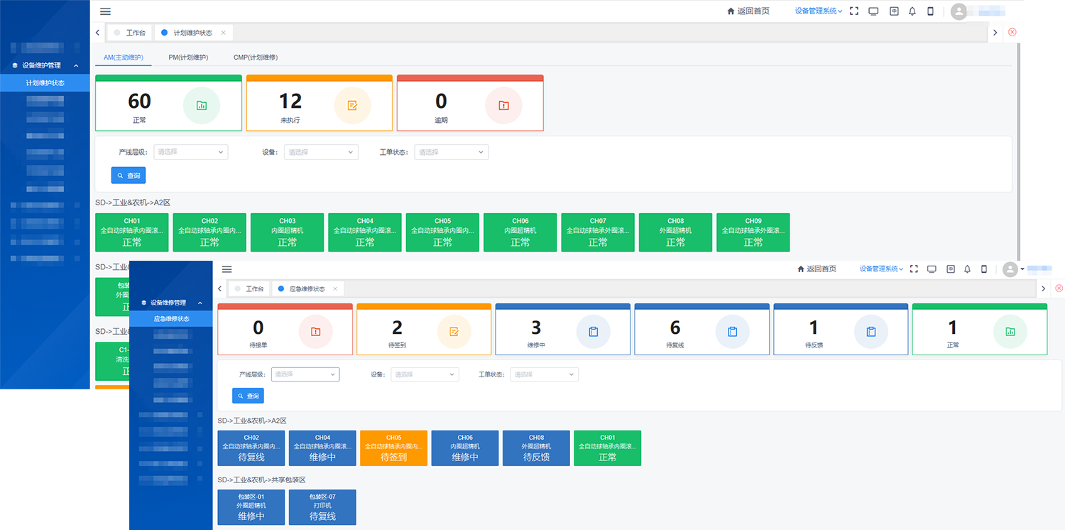 运维并非响应即可,防患方显真章。本次升级深度优化设备状态看板,通过重构查询逻辑,对应急维修状态和计划维护状态两个功能模块进行升级,为您打造透明化的“运维驾驶舱”。系统支持按产线、设备、状态进行灵活组合筛选,一键穿透实时状态与维修进度,将复杂信息转化为清晰洞察,助力每一次调度精准高效,大幅缩短故障响应,减少非计划停机,持续提升设备综合效率(OEE)。