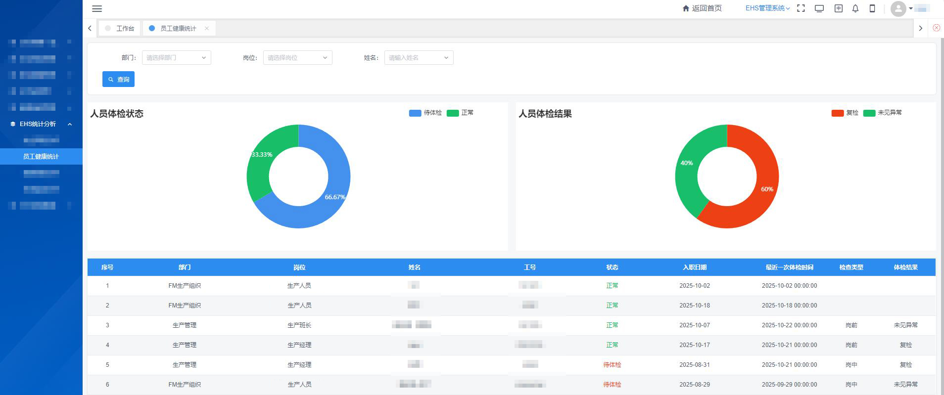 健康管理不止于记录,更在于洞察。本次同步上线“员工健康统计分析”功能,系统自动聚合待检人数、异常指标分布与历史趋势,生成多维度可视化报表。管理者可快速识别健康风险高发群体与变化规律,为岗位调配、健康干预与体系优化提供数据支撑,真正实现从“健康管理”到“健康治理”的跨越。