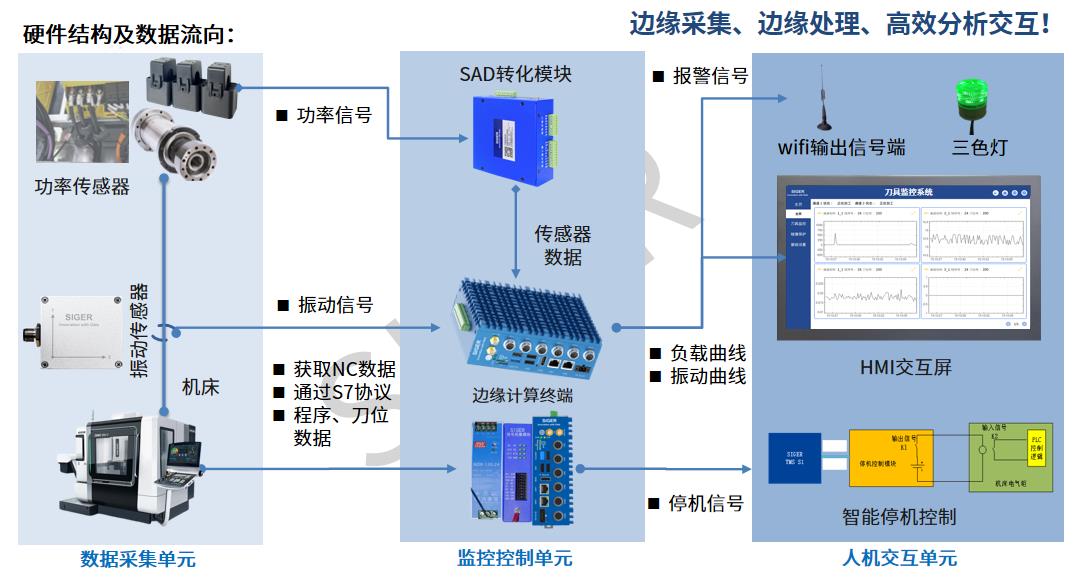 刀具监控系统(Tooling Monitoring System,TMS)是一种针对精密加工过程中刀具状态监控和管理的解决方案,该系统通过边缘传感器收集数据,并利用智能算法分析这些数据,以实时监控刀具状态,断刀、崩刃智能诊断,并实现停机控制,真正意义上做到预测刀具寿命,帮助企业在生产过程中对停机换刀的处理更加游刃有余,避免因崩刃断刀而造成的设备损坏与产品质量损失!