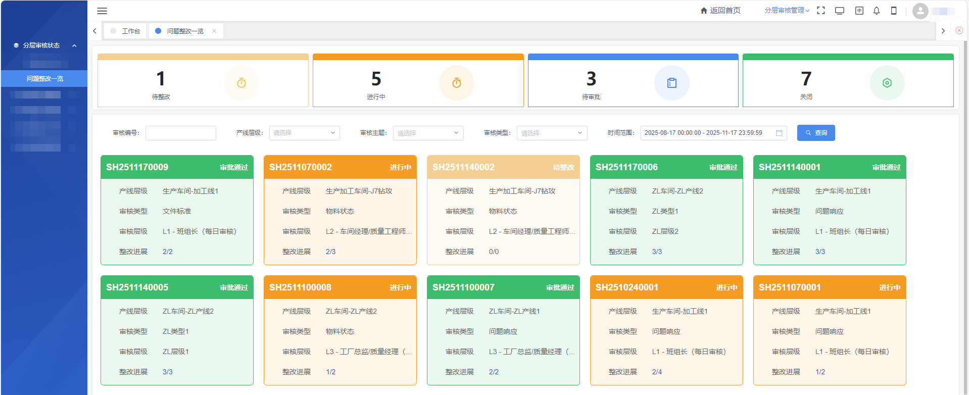 问题重在改进,闭环方显价值。同步上线的“整改状态一览”功能,精准追踪每个发现问题的整改进展与处理结果。系统将整改任务状态实时可视化,帮助质量主管快速定位待处理事项,确保每个问题都有明确的改进路径与完成节点,推动质量管理从"问题发现"迈向"问题解决"的实质闭环。