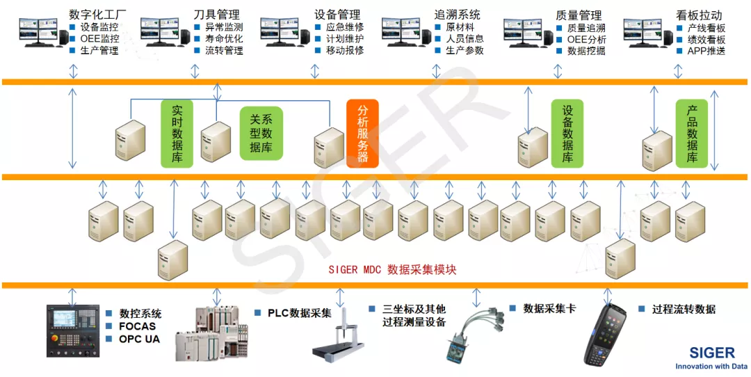 SIGER MES系统总体架构采用分离式架构,底层为MDC(machine data collection:设备数据采集层),中间采用大数据流式处理架构,能够支撑数百台到数千台设备数据同时集成,无延迟;上层结合ERP和PLM,完成业务场景的融合,提供精密加工数字化工厂全模块管理,最大限度满足各级管理人员获取车间信息的需求,让各层管理人员能够真正的实时看到生产状况、随时知道生产结果。